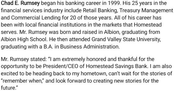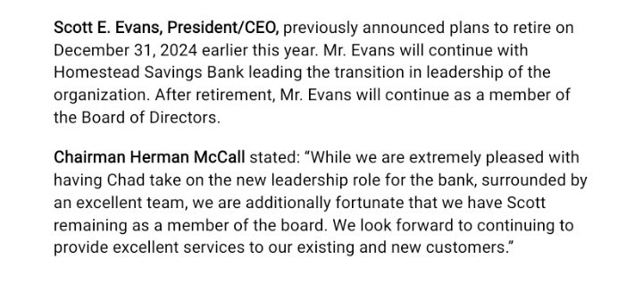 The Board of Directors of Homestead Savings Bank is pleased to announce Chad E. Rumsey as the next President/CEO effective July 1, 2024. Current President/CEO Scott E. Evans announced his pending retirement in February 2024.