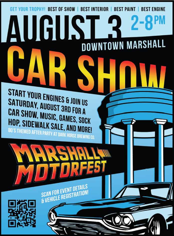 Marshall Motorfest is coming August 3rd, 2024. Michigan Avenue will be closed, and the streets will be lined with the classics, hot rods, and exotics. Come hang out and have a good time, check out rides and then stay for the after party at Dark Horse Brewing Company – 80’s & 90’s Style!